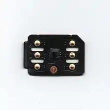 After a debate in early 2012 between a few designs created by Apple, Nokia and RIM, Apple's design for an even smaller SIM card was accepted by the ETSI.[27][28] The nano-SIM (or 4FF) card was introduced in June 2012, when mobile service providers in various countries first supplied it for phones that supported the format. The nano-SIM measures 12.3 mm × 8.8 mm × 0.67 mm (0.484 in × 0.346 in × 0.026 in) and reduces the previous format to the contact area while maintaining the existing contact arrangements.[29] A small rim of isolating material is left around the contact area to avoid short circuits with the socket. The nano-SIM can be put into adapters for use with devices designed for 2FF or 3FF SIMs, and is made thinner for that purpose,[30] and telephone companies give due warning about this.[31] 4FF is 0.67 mm (0.026 in) thick, compared to the 0.76 mm (0.030 in) of its predecessors.