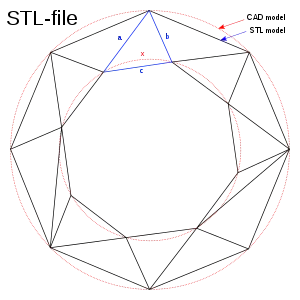 ![]() A CAD representation of a torus (shown as two concentric red circles) and an STL approximation of the same shape (composed of triangular planes) | |