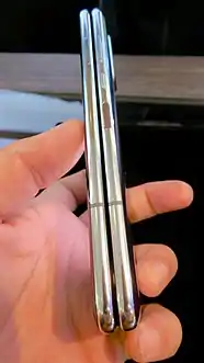 The device contains two batteries split between the two halves totaling 4380 mAh. The Galaxy Fold contains 6 cameras, using the same sensors equipped on the Galaxy S10+,[24] including three rear-facing camera lenses (12-megapixel, 12-megapixel telephoto, and 16-megapixel ultra wide-angle), as well as a 10-megapixel front-facing camera on the cover, and a second 10-megapixel front-facing camera, accompanied by an RGB depth sensor, on the inside screen.[27][28][29]