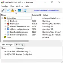 ![]() Sandboxie Plus running two sandboxes. ("DefaultBox" is running four apps: Dusk, Firefox, LibreOffice, and qBittorrent; while the "Safe" sandbox is inactive) | |
