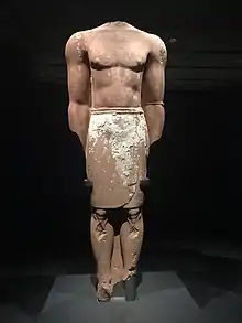 The earliest sedentary culture in Saudi Arabia dates back to the Ubaid period at Dosariyah. Climatic change and the onset of aridity may have brought about the end of this phase of settlement, as little archaeological evidence exists from the succeeding millennium.[62] The settlement of the region picks up again in the period of Dilmun in the early 3rd millennium. Known records from Uruk refer to a place called Dilmun, associated on several occasions with copper, and in later periods it was a source of imported woods in southern Mesopotamia. Scholars have suggested that Dilmun originally designated the eastern province of Saudi Arabia, notably linked with the major Dilmunite settlements of Umm an-Nussi and Umm ar-Ramadh in the interior and Tarout on the coast. It is likely that Tarout Island was the main port and the capital of Dilmun.[61] Mesopotamian inscribed clay tablets suggests that, in the early period of Dilmun, a form of hierarchical organized political structure existed. In 1966, an earthwork in Tarout exposed an ancient burial field that yielded a large statue dating to the Dilmunite period (mid 3rd millennium BC). The statue was locally made under the strong Mesopotamian influence on the artistic principle of Dilmun.[61]