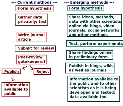 | Research done privately; then submitted to journals; then peer-reviewed by gatekeepers in major journals; published | Research data shared during discovery stages; ideas shared; scientists collaborate; then findings are disseminated online |