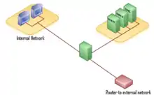 In network security a screened subnet refers to the use of one or more logical screening routers as a firewall to define three separate subnets: an external router (sometimes called an access router), that separates the external network from a perimeter network, and an internal router (sometimes called a choke router) that separates the perimeter network from the internal network. The perimeter network, also called a border network or demilitarized zone (DMZ), is intended for hosting servers (sometimes called bastion hosts) that are accessible from or have access to both the internal and external networks.[1][2][3] The purpose of a screened subnet or DMZ is to establish a network with heightened security that is situated between an external and presumed hostile network, such as the Internet or an extranet, and an internal network.