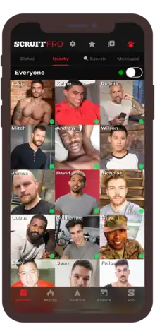 Scruff (stylised as SCRUFF) is an international social application for men seeking men that runs on iOS and Android devices.[1] The app allows users to upload profiles and photos, and search for other members by location and shared interests. Users can directly message other users or they can use the app's "Woof" feature, which allows users to express interest in another user's profile.
