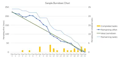 Often used in scrum, a burndown chart is a publicly displayed chart showing remaining work.[35] Updated every day, it provides quick visualizations for reference. The horizontal axis of the burndown chart shows the days remaining, while the vertical axis shows the amount of work remaining each day. During sprint planning, the ideal burndown chart is plotted. Then, during the sprint, developers update the chart with remaining work so the chart is updated day by day, showing a comparison between actual and predicted.