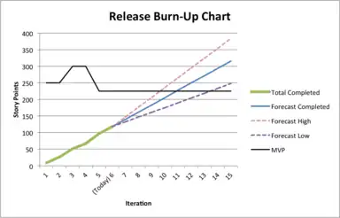 Updated at the end of each sprint, the release burn-up chart shows progress towards delivering a forecast scope. The horizontal axis of the release burn-up chart shows the sprints in a release, while the vertical axis shows the amount of work completed at the end of each sprint.