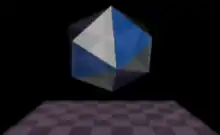 ![]() Bouncing polyhedron Bouncing polyhedronThe music has now finished its introductory notes at this point and the first melody starts. Next, a glenz (additively blended) polyhedron appears and bounces on the checkered surface, in perfect timing with the orchestra hits in the score, demonstrating 3D rendering and real-time mesh deformation. After a while, another larger polyhedron appears and the smaller polyhedron begins bouncing inside the larger. |