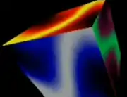 ![]() Colored spinning cube Colored spinning cubeAfter a few surfaces have been displayed, a cube with animated surfaces attached comes up and spins around while translating towards and away from the camera. |