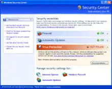 Microsoft learned from discussions with customers that there was confusion as to whether users were taking appropriate steps to protect their systems, or if the steps they were taking were effective.[2] From this research, Microsoft made the decision to include a visible control panel with Windows XP Service Pack 2 that would provide a consolidated view of the most important security features. Service Pack 2, released in August 2004, includes the first version of Windows Security Center (WSC). This version monitors Windows Update, Windows Firewall, and the availability of an anti-virus program. Third-party providers of personal firewall and anti-virus software packages were encouraged to use WSC API to register their products with WSC.