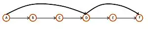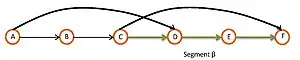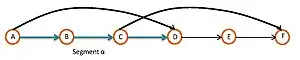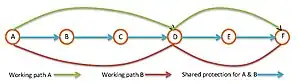 "Shared segment protection", on the right, illustrated a shared-non-overlapping segment protection. Working paths, A and B, both have segment protection. The first segment protection path consists of, node A to B to C to D and the second consists of, node D to E to F. In this example we can see that if part of working path A, node D to F, would fail that node D would use its shred segment protection for that segment. The new path for working path A would be, A to D to E to F. Of course, if a second failure occurred on the same segment before the first failure is fixed a recovery would not be possible.[2]