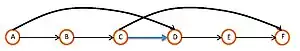 In "Working path" animation on the right it can be seen that for a chosen route the primary path becomes the working path. This example illustrates that the source (node A) is routed to B,then C,D,E, and lastly the destination (node F). We can see that segment protection has been implemented. Segment consists of nodes A, B, C, and D while segment consists of nodes C, D, E, and F. Lets assume that link B-C failed. Nodes B and C know that the link between them is down so they signal to their neighboring nodes that a link is down and to move to a backup path. Node A sends its traffic over to node D directly. Node D then sends the traffic over its route to E then finally destination F.