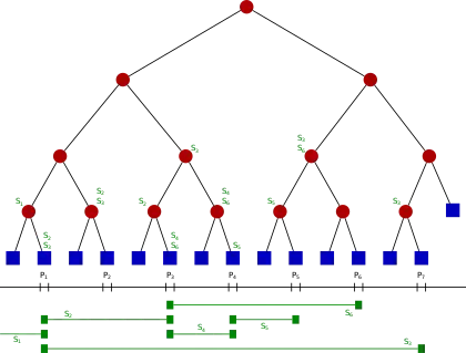 - The internal nodes of T correspond to intervals that are the union of elementary intervals: the interval Int(N) corresponding to node N is the union of the intervals corresponding to the leaves of the tree rooted at N. That implies that Int(N) is the union of the intervals of its two children.