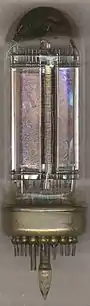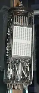 The smaller capacity 256-bit (128 by 2 bits) "production" device[8] was in a similar vacuum-tube envelope. It was built with two storage arrays of discrete "eyelets" on a rectangular plate, separated by a row of eight cathodes. The pin count was reduced from 44 for the 4096-bit device down to 31 pins and two coaxial signal output connectors. This version included visible green phosphors in each eyelet so that the bit status could also be read by eye.