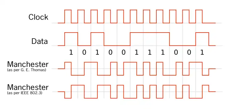 If the embedded clock signal is isochronous, it gets sent simultaneously with the data. Below is an example signal, in this case using the Manchester code self-clocking signal. The data and clock cycles can be thought of as "adding up" to a combination, where both the clock cycle and the data can be retrieved from the transmitted signal.