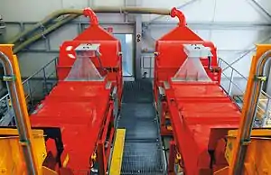 During the more than 80 years of technical development of sensor-based ore sorting equipment, various types of machines have been developed. This includes the channel-type, bucket-wheel type and cone type sorters.[9][10] The main machine types being installed in the mining industry today are belt-type and chute-type machines. Harbeck made a good comparison of both disadvantages and advantages of the systems for different sorting applications.[11] The selection of a machine-type for an application depends various case-dependent factors, including the detection system applied, particle size, moisture, yield amongst others.