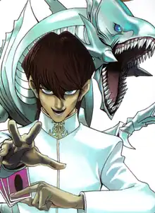 ![]() Seto Kaiba as illustrated by Kazuki Takahashi alongside his Blue-Eyes White Dragon | |