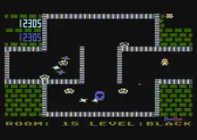 Inspired by the arcade game Berzerk,[2][3] the objective of the game is to navigate the eponymous robotic detective through a 4-skill level, 128-room maze of electrified walls. The ultimate goal at the end of this journey is "The Shadow's Lair". Shamus differs from Berzerk in having a persistent world instead of rooms that are randomly generated each time they are entered. There are also items to collect: bottles containing extra lives, mystery question marks, and keys which open exits.