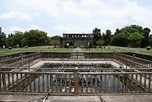 The complex had an impressive lotus-shaped fountain: the Hazari Karanje (Fountain of a thousand jets). It was constructed for the pleasure of the infant Peshwa Sawai Madhavrao. It was designed as a sixteen petal lotus; each petal had sixteen jets with an eighty-foot arch. It was the most complicated and intricate fountain of its time.