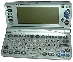 The later Sharp Wizards were something between an electronic databank and a PDA. They were small, lightweight devices with keyboards but no touch screen, running on a Zilog Z80.