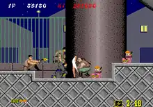 Enemies include punks, mercenaries, ninjas, and the Mongolian swordsmen guarding each hostage. Musashi can bump into most enemies without harm and can only be killed if he gets struck by an enemy's attack, gets hit by a projectile, or falls into a bottomless hole. Then, the stage restarts but retains any saved hostages. When the player runs out of lives, additional coins will continue the game except the final mission. The time limit is three minutes per stage and bonus points are awarded for time, with additional bonuses for refraining from ninjutsu technique (except on the fifth level) or using only melee attacks. Extra lives are awarded for achieving certain scores, completing the bonus round, or rescuing a special hostage.