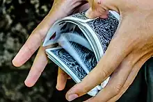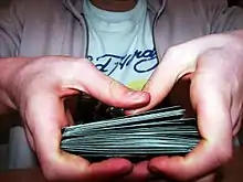 One of the easiest shuffles to accomplish after a little practice is the overhand shuffle. Johan Jonasson wrote, "The overhand shuffle... is the shuffling technique where you gradually transfer the deck from, say, your right hand to your left hand by sliding off small packets from the top of the deck with your thumb."[1] In detail as normally performed, with the pack initially held in the left hand (say), most of the cards are grasped as a group from the bottom of the pack between the thumb and fingers of the right hand and lifted clear of the small group that remains in the left hand. Small packets are then released from the right hand a packet at a time so that they drop on the top of the pack accumulating in the left hand. The process is repeated several times. The randomness of the whole shuffle is increased by the number of small packets in each shuffle and the number of repeat shuffles performed.