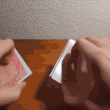 A common shuffling technique is called the riffle, or dovetail shuffle or leafing the cards, in which half of the deck is held in each hand with the thumbs inward, then cards are released by the thumbs so that they fall to the table interleaved. Many also lift the cards up after a riffle, forming what is called a bridge which puts the cards back into place; it can also be done by placing the halves flat on the table with their rear corners touching, then lifting the back edges with the thumbs while pushing the halves together. While this method is more difficult, it is often used in casinos because it minimizes the risk of exposing cards during the shuffle. There are two types of perfect riffle shuffles: if the top card moves to be second from the top then it is an in shuffle, otherwise it is known as an out shuffle (which preserves both the top and bottom cards).