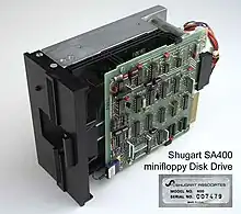 The 5+1⁄4-inch floppy disk drive was introduced by Shugart in September 1976 as the Shugart SA-400 Minifloppy (Shugart's trademarked brand name)[4] at an OEM price of $390 for the drive and $45 for ten diskettes.[5] The SA-400 and related models became the company's best selling products, with shipments of up to 4000 drives per day.