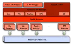 RADICAL-SAGA[14] is a light-weight Python package that implements parts of the OGF GFD.90[1] interface specification and provides plug-ins for different distributed middleware systems and services. RADICAL-SAGA implements the most commonly used features of GFD.90 based upon extensive use-case analysis, and focuses on usability and simple deployment in real-world heterogeneous distributed computing environments and application scenarios. RADICAL-SAGA currently implements the job and the file management core APIs as well as the resource management API extension. RADICAL-SAGA provides plug-ins for different distributed middleware systems and services, including support for the PBS, Sun Grid Engine, SSH, SFTP and others. RADICAL-SAGA can be used to develop distributed applications and frameworks that run on distributed cyber-infrastructure including XSEDE,[15] LONI and FutureGrid,[16] other clouds and local clusters.