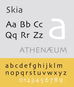 Skia is a humanist sans-serif typeface designed by Matthew Carter for Apple Computer in 1994.[1] Skia is Greek for "shadow", and the letterforms take inspiration from stone-carved 1st century BC Greek writing. The typeface was the first QuickDraw GX font, and has been pre-installed in Mac operating systems since System 7.5 (1994), and is in the current Mac OS.