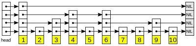 In computer science, a skip list (or skiplist) is a probabilistic data structure that allows average complexity for search as well as average complexity for insertion within an ordered sequence of elements. Thus it can get the best features of a sorted array (for searching) while maintaining a linked list-like structure that allows insertion, which is not possible with a static array. Fast search is made possible by maintaining a linked hierarchy of subsequences, with each successive subsequence skipping over fewer elements than the previous one (see the picture below on the right). Searching starts in the sparsest subsequence until two consecutive elements have been found, one smaller and one larger than or equal to the element searched for. Via the linked hierarchy, these two elements link to elements of the next sparsest subsequence, where searching is continued until finally searching in the full sequence. The elements that are skipped over may be chosen probabilistically[2] or deterministically,[3] with the former being more common.