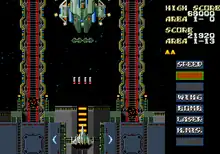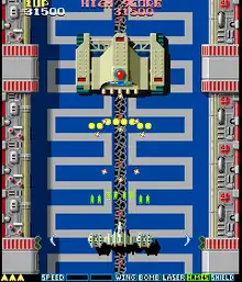 Major weapons affect the enemies and terrain differently. For example, certain enemy towers can only be destroyed with laser or homing missile shots; other enemies are destroyed much faster with specific weapons to match. If bomb or homing missile shots are equipped, certain bonus targets will appear or parts of the landscape may be destroyed to reveal bonuses. If laser is active, certain plants in the landscape can be shot repeatedly to grow and earn extra points until they scroll off-screen.[4] It has been reported that a bug in the game enabled the player to obtain all power-ups, simply by allowing themselves to be killed by the first enemy appearing upon starting the game without touching the controls. If this occurred, the next time the player's ship appears, it has all the power-ups equipped.[5]