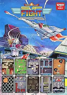 Slap Fight[lower-alpha 1] is a 1986 vertically scrolling shooter arcade video game developed by Toaplan and published by Taito. Set on the colonized fictional planet of Theron in the future, where an alien race led by Gaudy have invaded the human-controlled location, players assume the role of an Allied League of Cosmic Nations (ALCON) fighter pilot taking control of the SW475 space fighter craft in an effort to counterattack the invaders. Initially launched for the arcades, the game was later ported to other microcomputer and console platforms by various third-party developers, with each one featuring several changes or additions compared to the original release.