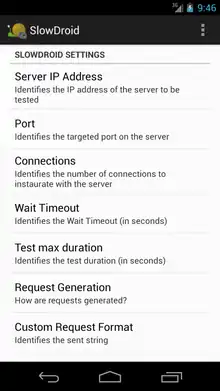 SlowDroid behavior[5] is similar to other Slow DoS Attacks[6] such as Slowloris, since it creates many connections with the victim in order to saturate the resources of the listening daemon application. One difference is on sent payload, which in case of SlowDroid is not compliant to a specific protocol: instead of sending a forged HTTP request, an endless sequence of spaces is sent instead. This characteristic makes SlowDroid able to target different protocols with the same payload. Another difference is on sending: during the data sending phase, instead of sending a sequence of characters as Slowloris does, SlowDroid sends a single character, hence reducing the bandwidth amounts. Finally, the main difference is on implementation: SlowDroid has been implemented to be executed on the Android mobile operating system platform.