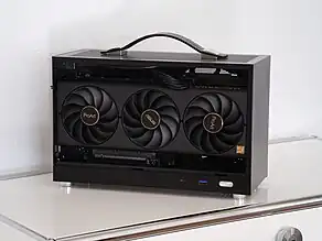 The graphics card is placed behind the motherboard and PSU, connecting to it via a PCI Express x16 extension cable. This design is popular with SFF enthusiasts as it packs high performance hardware into a small space while providing adequate cooling. Water cooling radiators may be added on to the top, bottom or sides to further increase cooling capacity. An electrically insulating sheet, such as thermoplastic polyurethane, may be placed between the motherboard/PSU and graphics card to implement separate airflow zones, isolating heat sources from each other to improve cooling.[28][29]