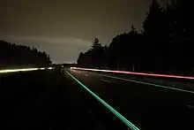The Smart Highway concept developed by Studio Roosegaarde and the infrastructure management group Heijmans in the Netherlands incorporated photo-luminescent paint for road markings, which absorb light during the day then glow for a period up to 10 hours. In its first design, the Glowing Lines charge during the daytime and glows for several hours at night to create a positive highway experience and increase safety.[20] In April 2014, a pilot stretch of highway in Brabant, Netherlands was officially opened, demonstrating the technology.[21][22] After two weeks, the paint had stopped glowing due to damage from moisture.[23]