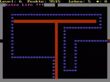 The first known home computer version, Worm, was programmed by Peter Trefonas for the TRS-80 and published by CLOAD magazine in 1978.[2] Versions followed from the same author for the Commodore PET and Apple II. An authorized version of the Hustle arcade game, itself a clone of Blockcade, was published by Milton Bradley for the TI-99/4A in 1980.[7]