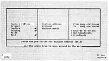 The Sniffer was implemented above Microsoft’s MS-DOS operating system, and used a 40 line 80-character text-only display. The first version, the PA-400 protocol analyzer for Token-Ring networks,[21] was released on a Compaq Portable II “luggable” computer that had an Intel 80286 processor, 640 KB of RAM, a 20 MB internal hard disk, a 5 ¼” floppy disk drive, and a 9” monochrome CRT screen. The retail price of the Sniffer in unit quantities was $19,995.[22]