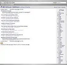 Social bookmarking is an online service which allows users to add, annotate, edit, and share bookmarks of web documents.[1][2] Many online bookmark management services have launched since 1996; Delicious, founded in 2003, popularized the terms "social bookmarking" and "tagging". Tagging is a significant feature of social bookmarking systems, allowing users to organize their bookmarks and develop shared vocabularies known as folksonomies.