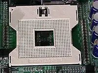 Socket 604 was designed by Intel as a zero insertion force socket intended for workstations and server platforms. While the socket contains 604 pins, it only has 603 electrical contacts, the last being a dummy pin.[1] Each contact has a 1.27mm pitch with regular pin array, to mate with a 604-pin processor package.
