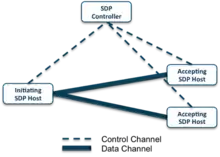 In its simplest form, the architecture of the SDP consists of two components: SDP Hosts and SDP Controllers.[6] SDP Hosts can either initiate connections or accept connections. These actions are managed by interactions with the SDP Controllers via a control channel (see Figure 1). Thus, in a Software Defined Perimeter, the control plane is separated from the data plane to enable greater scalability. In addition, all of the components can be redundant for higher availability.
