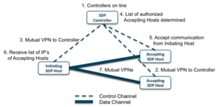 - After authenticating the Initiating SDP Host, the SDP Controllers determine a list of Accepting Hosts to which the Initiating Host is authorized to communicate.
