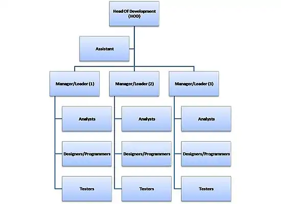 The manager of a software company is usually called the Head Of Development (HOD),[2] and reports to the stakeholders. He or she leads the sub-teams directly or via the managers/leaders depending on the size of the organization. Usually teams of up to 10 person are the most operational. In bigger organizations, there are in general two models of the hierarchy: