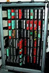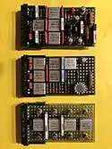 SLT uses dual diode chips and individual transistor chips each approximately 0.025 inches (0.64 mm) square.[3]: 15 The chips are mounted on a 0.5 inches (13 mm) square substrate with silk-screened resistors and printed connections. The whole is encapsulated to form a 0.5 inches (13 mm) square module. Up to 36 modules are mounted on each card, though a few card types had just discrete components and no modules. Cards plug into boards which are connected to form gates which form frames.[3]: 15