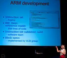 Wilson first designed a microcomputer during a break from studies at Selwyn College, Cambridge. She subsequently joined Acorn Computers and was instrumental in designing the BBC Microcomputer, including the BBC BASIC programming language.[9] She first began designing the ARM reduced instruction set computer (RISC) in 1983, which entered production two years later. It became popular in embedded systems and is now the most widely used processor architecture in smartphones. In 2011, she was listed in Maximum PC as number 8 in an article titled "The 15 Most Important Women in Tech History".[10] She was made a Commander of the Order of the British Empire in 2019.