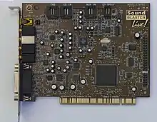 Sound Blaster Live! is a PCI add-on sound card from Creative Technology Limited for PCs. Moving from ISA to PCI allowed the card to dispense with onboard memory, storing digital samples in the computer's main memory and then accessing them in real time over the bus. This allowed for a much wider selection of, and longer playing, samples. It also included higher quality sound output at all levels, quadrophonic output, and a new MIDI synthesizer with 64 sampled voices. The Live! was introduced on August 11, 1998[1] and variations on the design remained Creative's primary sound card line into the early 2000's.