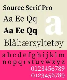 Source Serif (known as Source Serif Pro before 2021)[2] is a serif typeface created by Frank Grießhammer for Adobe Systems. It is the third open-source font family from Adobe, distributed under the SIL Open Font License.[3]