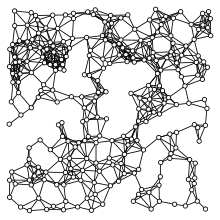 A spatial network (sometimes also geometric graph) is a graph in which the vertices or edges are spatial elements associated with geometric objects, i.e., the nodes are located in a space equipped with a certain metric.[1][2] The simplest mathematical realization of spatial network is a lattice or a random geometric graph (see figure in the right), where nodes are distributed uniformly at random over a two-dimensional plane; a pair of nodes are connected if the Euclidean distance is smaller than a given neighborhood radius. Transportation and mobility networks, Internet, mobile phone networks, power grids, social and contact networks and biological neural networks are all examples where the underlying space is relevant and where the graph's topology alone does not contain all the information. Characterizing and understanding the structure, resilience and the evolution of spatial networks is crucial for many different fields ranging from urbanism to epidemiology.