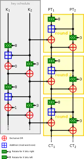 ![]() 3 rounds of Speck with 2-word key schedule | |