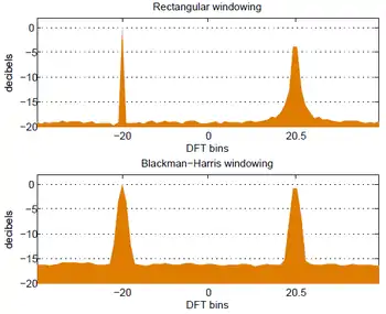 When the input waveform is time-sampled, instead of continuous, the analysis is usually done by applying a window function and then a discrete Fourier transform (DFT). But the DFT provides only a sparse sampling of the actual discrete-time Fourier transform (DTFT) spectrum. Figure 2, row 3 shows a DTFT for a rectangularly-windowed sinusoid. The actual frequency of the sinusoid is indicated as "13" on the horizontal axis. Everything else is leakage, exaggerated by the use of a logarithmic presentation. The unit of frequency is "DFT bins"; that is, the integer values on the frequency axis correspond to the frequencies sampled by the DFT.[2]: p.56 eq.(16) So the figure depicts a case where the actual frequency of the sinusoid coincides with a DFT sample, and the maximum value of the spectrum is accurately measured by that sample. In row 4, it misses the maximum value by ½ bin, and the resultant measurement error is referred to as scalloping loss (inspired by the shape of the peak). For a known frequency, such as a musical note or a sinusoidal test signal, matching the frequency to a DFT bin can be prearranged by choices of a sampling rate and a window length that results in an integer number of cycles within the window.