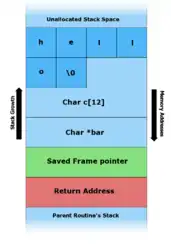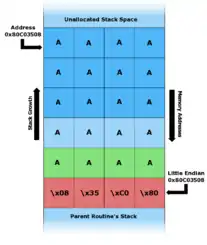 In software, a stack buffer overflow or stack buffer overrun occurs when a program writes to a memory address on the program's call stack outside of the intended data structure, which is usually a fixed-length buffer.[1][2] Stack buffer overflow bugs are caused when a program writes more data to a buffer located on the stack than what is actually allocated for that buffer. This almost always results in corruption of adjacent data on the stack, and in cases where the overflow was triggered by mistake, will often cause the program to crash or operate incorrectly. Stack buffer overflow is a type of the more general programming malfunction known as buffer overflow (or buffer overrun).[1] Overfilling a buffer on the stack is more likely to derail program execution than overfilling a buffer on the heap because the stack contains the return addresses for all active function calls.